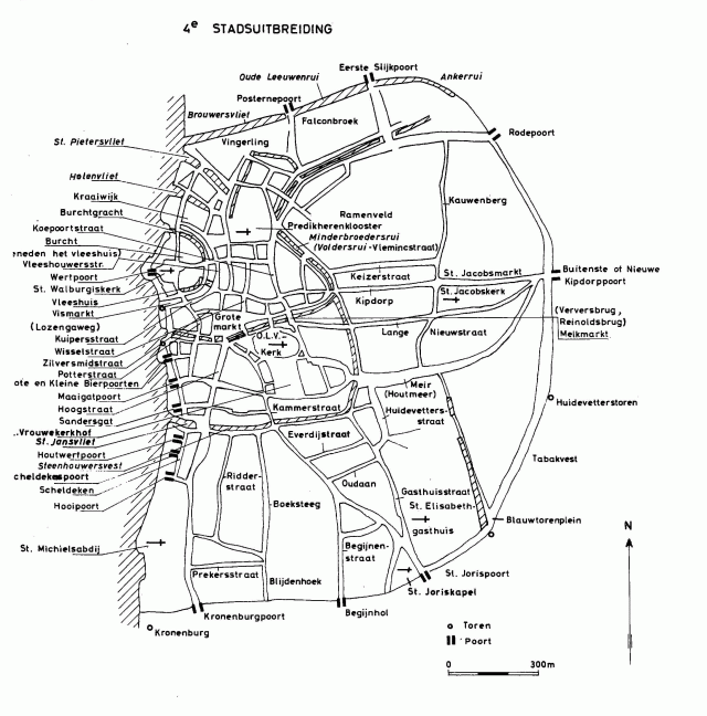 Een gebied van nog eens zo’n 20 hectare om de Ruienstad wordt voorzien van aarden wallen met stenen poorten en daarbuiten een gracht. Sint-Jansvliet, Steenhouwersvest en Lombardenvest vormen de zuidelijke grens. De Burcht krijgt een stenen muur.