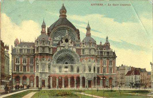 Het Centraal Station, waarlangs ontelbare migranten arriveerden in Antwerpen. Prentbriefkaart (a).