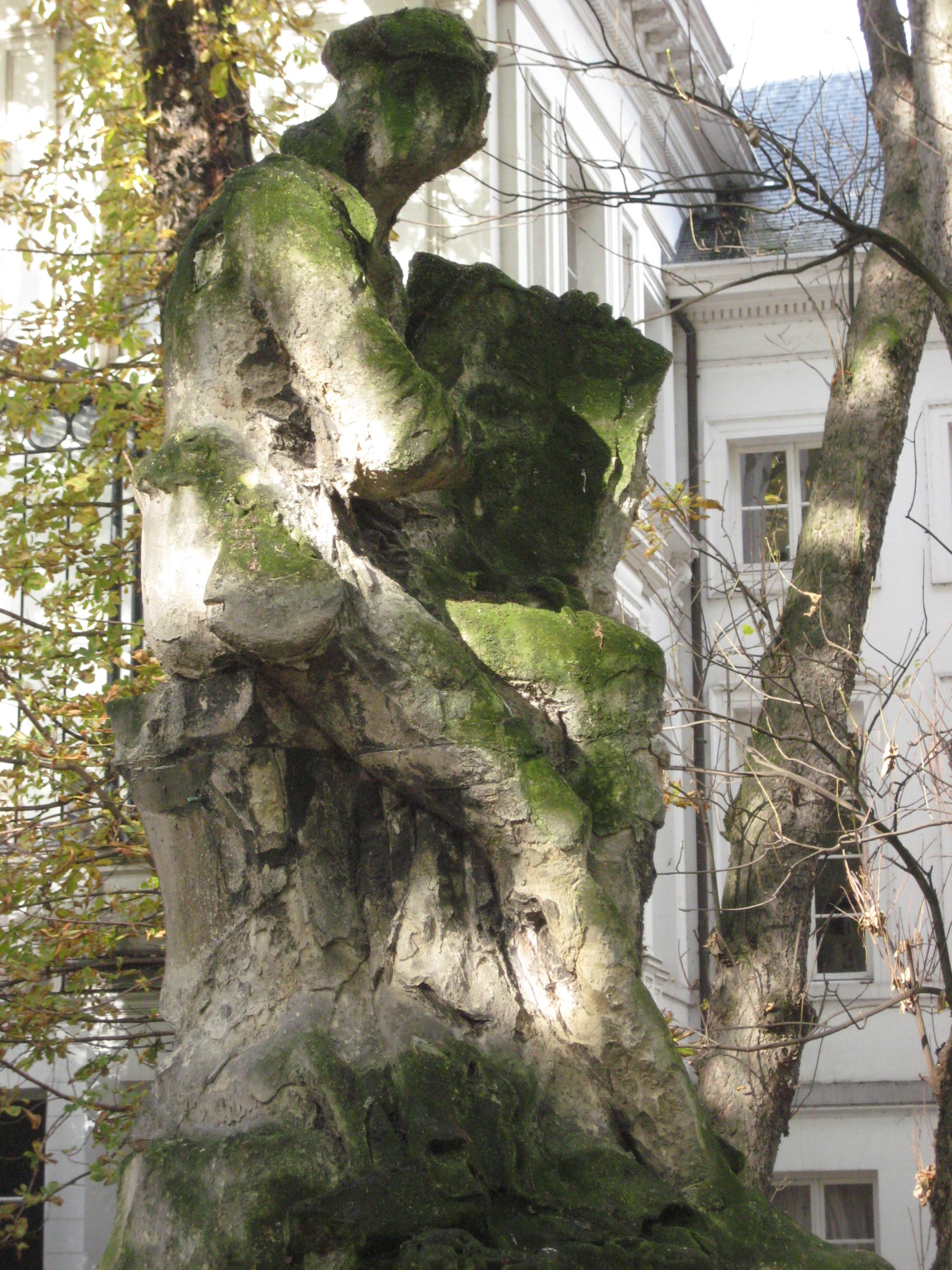 Het verweerde beeld van Quinten Metsys door Charles Geerts uit 1836 in de tuin aan de Mutsaertstraat (foto Jan Lampo).