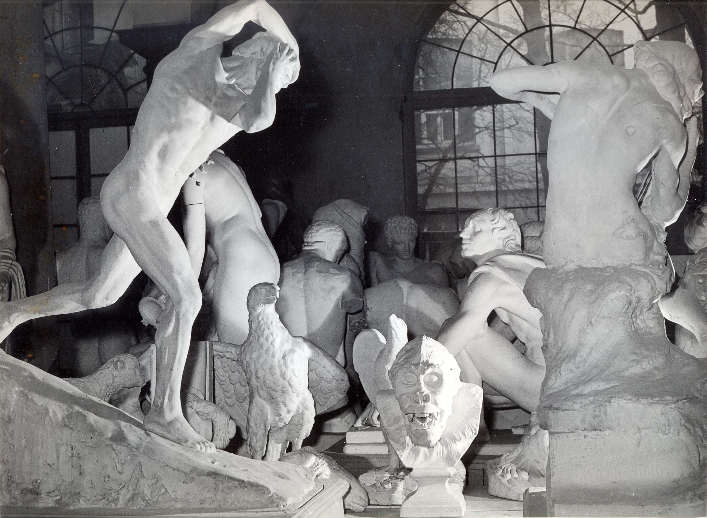 ”De beelden, welke tot model dienden waren Hercules, de Gladiator en een Sater. […] Het beeld, dat tot studie in gebruik was, stond op een voetstuk, vóor de groote koperen hanglamp met zes bekken, die gedekt waren met eenen lichtscherm die de klaarte in overvloed op het beeld kaatste. De leerlingen zaten in eenen halven kring om het model: de teekenaars voorop, en achter deze de bootseerders.”