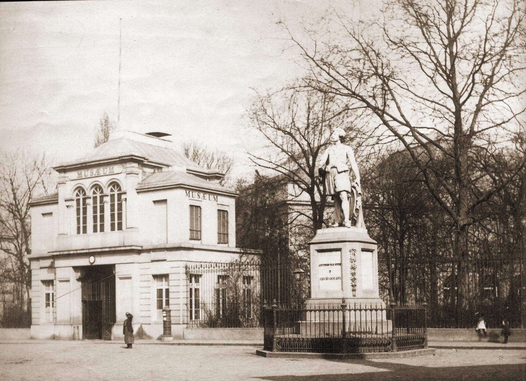 Het Museumplein, zoals het vroeger heette, met het poortgebouw en het standbeeld van Antoon Van Dijck.