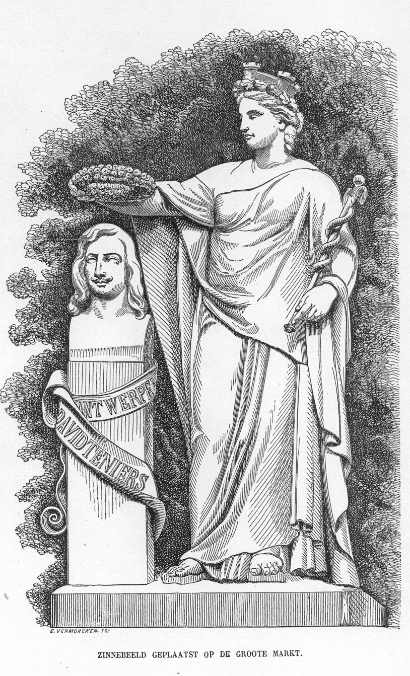 Op de Grote Markt staat dan weer een levensgroot beeld van de Maagd van Antwerpen met stedenkroon en Mercuriusstaf die het borstbeeld van David Teniers kroont. Het gaat om een werk van Jan Van Arendonck (1822-1881).
