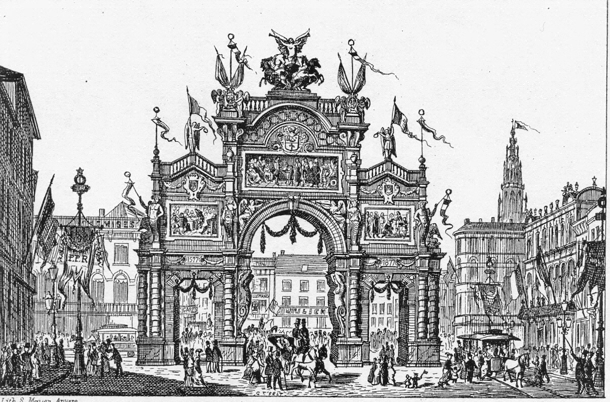 Antwerpen is feestelijk versierd met triomfbogen en andere versierselen van hout, textiel en bordkarton. Mertens en Torfs zeggen: “Op de Groote Markt was de Stad Antwerpen afgebeeld, door Mercurius en de Vrye Kunsten gekroond.” De Maagd van Antwerpen is dus wel degelijk present.
