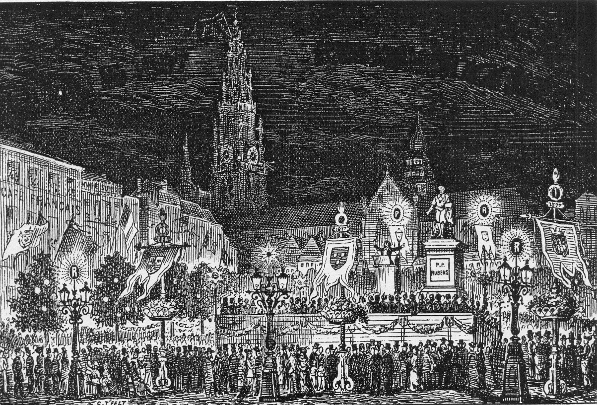 In 1840 vindt op het Burchtplein bij de Schelde de onthulling plaats van het standbeeld van Rubens. Omdat het bronzen beeld, dat gegoten wordt in Luik, niet op tijd klaar is, stelt men zich, noodgedwongen, tevreden met een gipsen model (de bronzen Rubens komt later op de Groenplaats). Tal van buitenlandse belangstellenden strijken neer in de stad.
