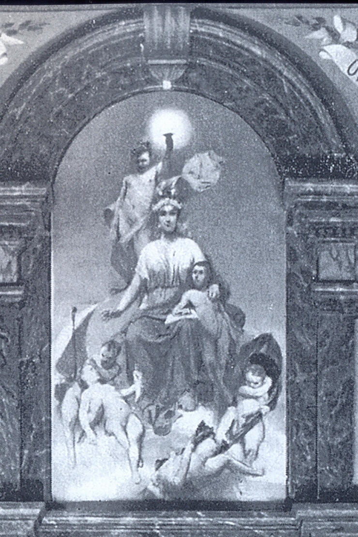 De twee overige plafonschilderingen, eveneens met de Maagd, dateren uit de 19de eeuw. Ze zijn het werk van Franz Vinck. Ik kom er later op terug.